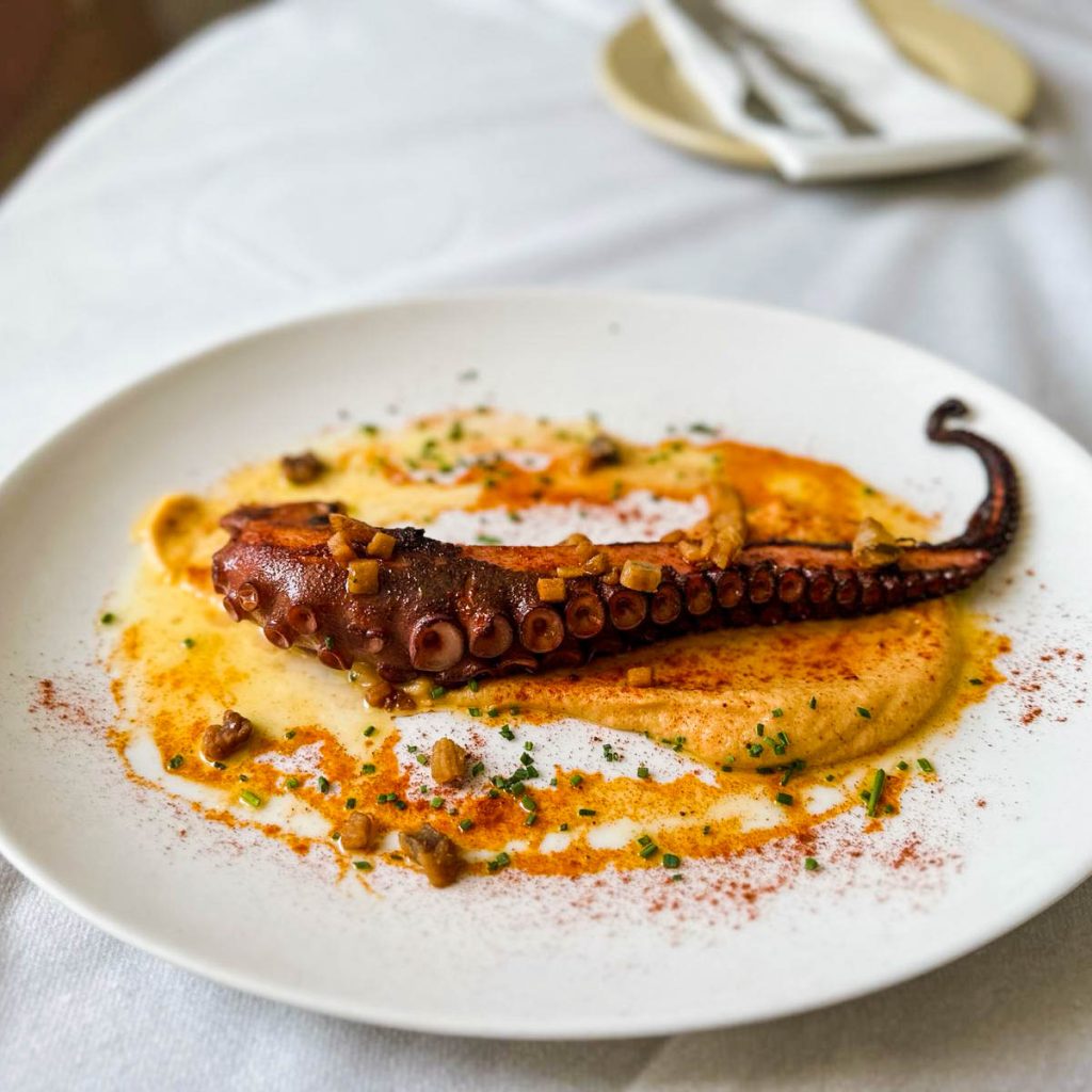 Nous avons commandé en entrée du poulpe et de la seiche qui étaient très bons. Surtout le poulpe avec une sauce dont je n’ai pas réussi à savoir exactement ce que c’était, elle contenait des légumes et m’a semblé même avoir le goût de la sauce romesco sans en être.